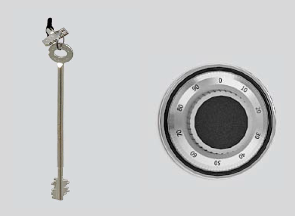 Dostupné zámky: 2x trezorový zámok na kľúč (KL), elektronický zámok (EL), mechanický kombinačný zámok (MC)