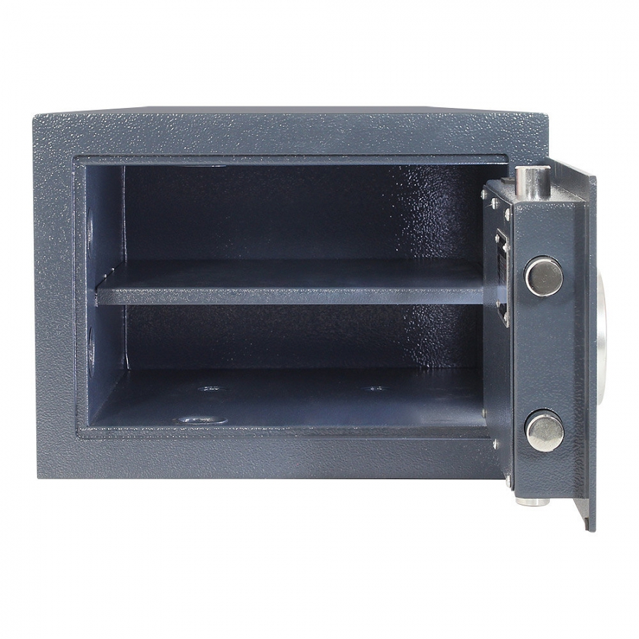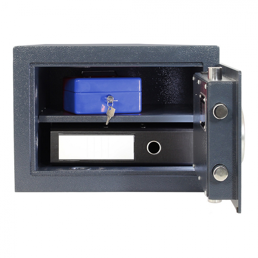 • Elektronický zámok EN-trieda 2, uzamykanie pomocou otočnej rukoväte, batéria umiestnená vo vnútri trezoru, núdzové pripojenie batérie zvonku