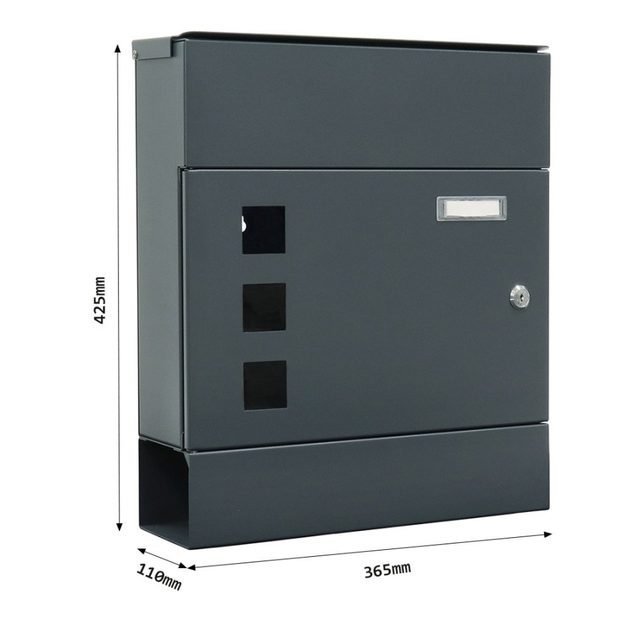 Poštová schránka vyrobená z kvalitnej pozinkovanej ocele, je vybavená cylindrickým zámkom (2 kľúče), je vhodná ako do exteriéru tak interiéru. Poštová schránka je balená samostatne v kartónovej krabici a súčasťou balenia je aj montážna sada (vruty, hmoždiny).