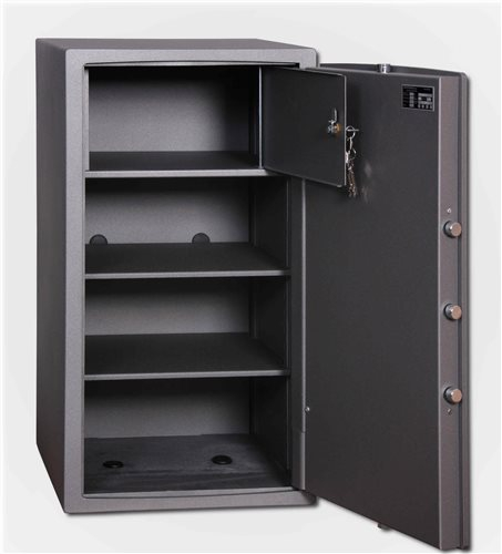 Praktický trezor radu NTR s mechanickým zámkom ovládaným kľúčom (zámok MAUER), vnútorná schránka je uzamykateľná kľúčom (Eurolock). Je veľmi praktický, môže byť dobre ukrytý napr. vo vstavanej skrine, aby nebol tak zbytočne na očiach. Vhodový na uloženie cenností, hotovosti, dokladov a listín formátu A4. Kvalitný a praktický trezor za najlepšiu cenu s certifikátom úrovne mechanického zabezpečenia uschovaných predmetov dôležitým pre prípady eventuálneho jednania s poisťovňou alebo napríklad v prípade úschovy zbraní a streliva. Vzhľadom na veľkosť a hmotnosť je samozrejme veľmi dôležité náležite trezor ukotviť k pevnému materiálu. Z výroby pripravený na kotvenie k stene (2 otvory) + k podlahe (2 otvory). Základným farebným prevedením je granit. Vnútri trezoru sú dve vyberateľné police a súčasťou výrobku sú 2 ks kľúčov.
